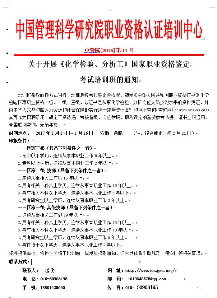 关于开展《化学检验、分析工》国家职业资格鉴定培训班