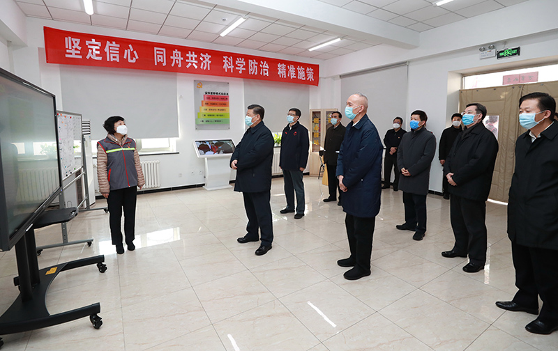 2月10日,中共中央总书记、国家主席、中央军委主席习近平在北京调研指导新冠肺炎疫情防控工作。这是习近平在朝阳区安贞街道安华里社区,了解基层一线疫情联防联控情况。新华社记者 庞兴雷 摄